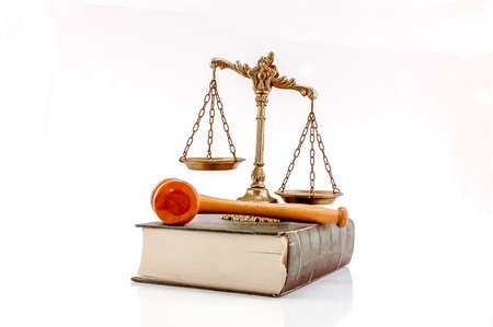Decorative Scales of Justice and judge gavel on the book, isolated on white. Law and order concept