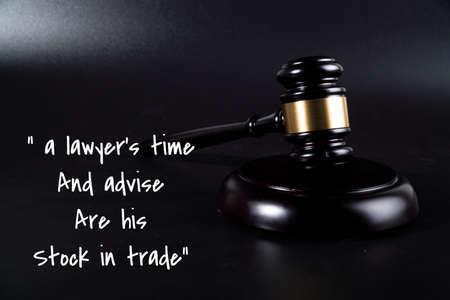 Wooden judge gavel and text on black background. Law and justice concept.