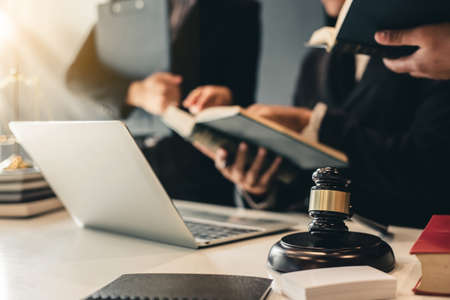 Judge gavel with Justice lawyers having team meeting at law firm background. Concepts of Law and Legal services.