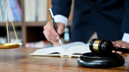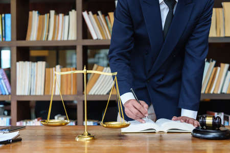 Law, lawyer attorney and justice concept, male lawyer or notary working on a documents and report of the important case in the law firm.