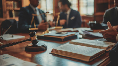 A small court judge's hammer is placed on the lawyer's table, the lawyer is advising the client to help them win the case against the defendant. The concept of litigation counseling for clients.