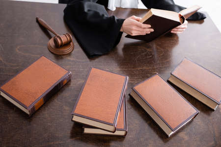 partial view of prosecutor reading book near collection of literature on desk