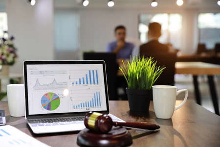 Small hammer gavel on the desk in the lawyer's room, using the law to judge with fairness and justice, defending the lawyer's case against the client. Concept of law and justice.