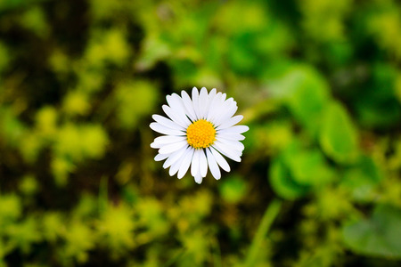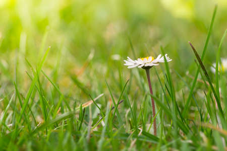 Small single daisy central located on green blurred meadow.