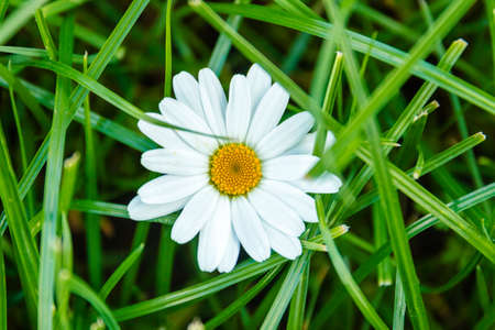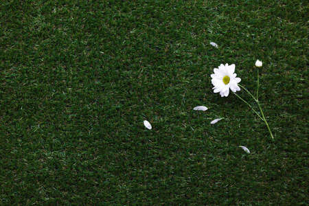 White daisy flower on green grass, top view, close up