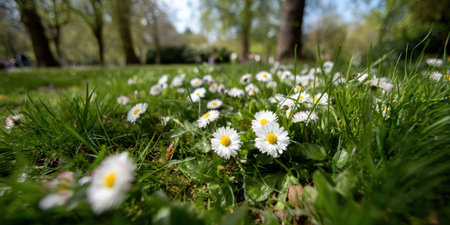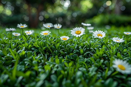 The Daisies are in Full Bloom on a Beautiful and Lush Green Lawn, Creating Joyful Vibes