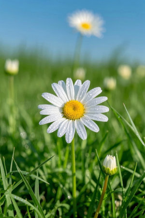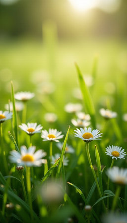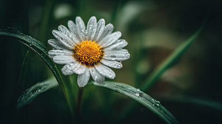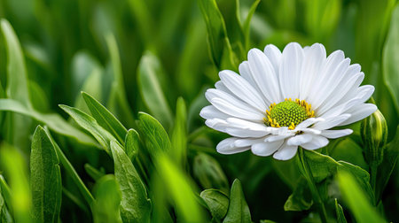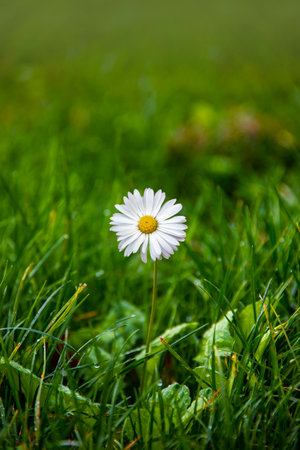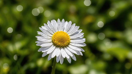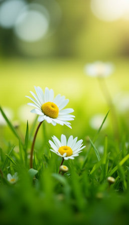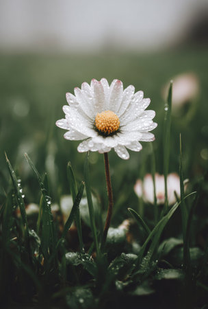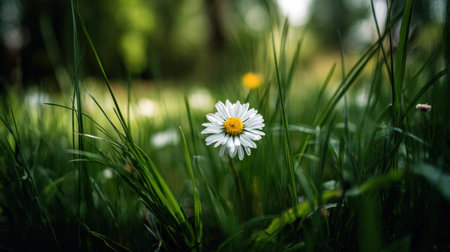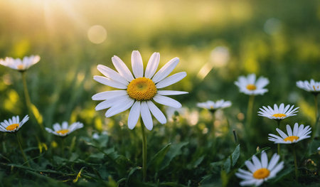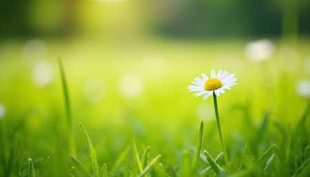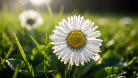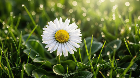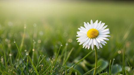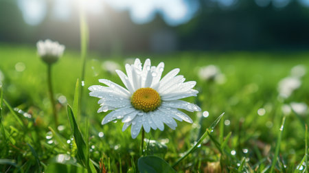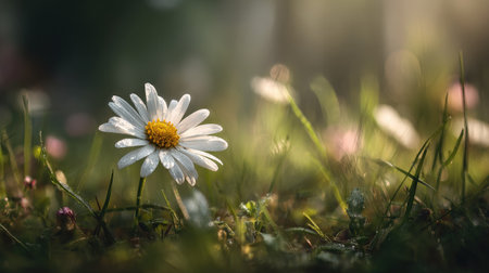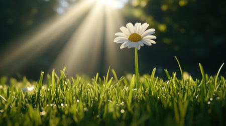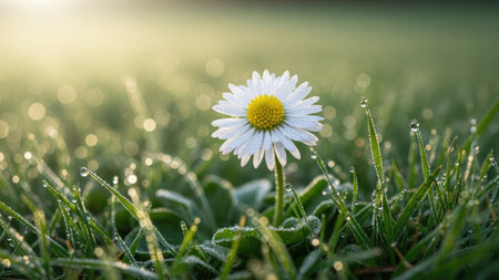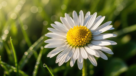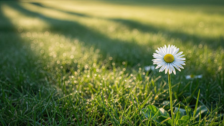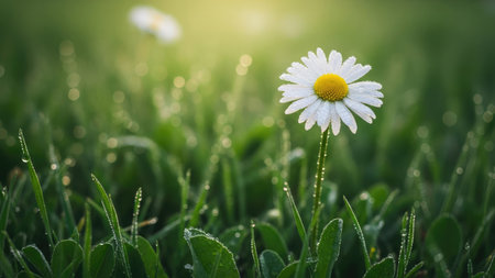 A daisy flower stands tall in a field of green grass, illuminated by soft sunlight. The composition features a shallow depth of field, highlighting the flower's white petals and yellow center. Dewdrops sparkle on the foliage creating a fresh and natural ambiance. This image can be used for various projects including design and editorial.