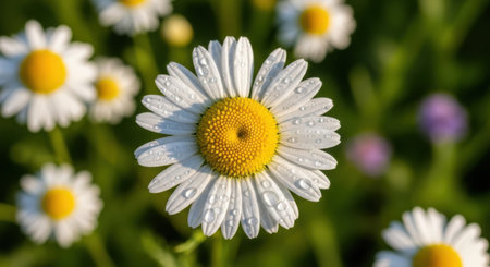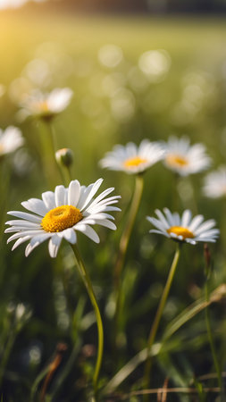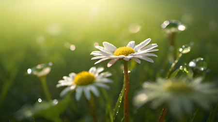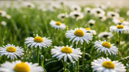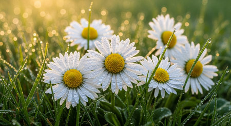 A serene close up of daisy flowers in a field, dew drops glistening in the morning sun. Perfect nature wallpaper for spring season.
