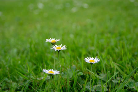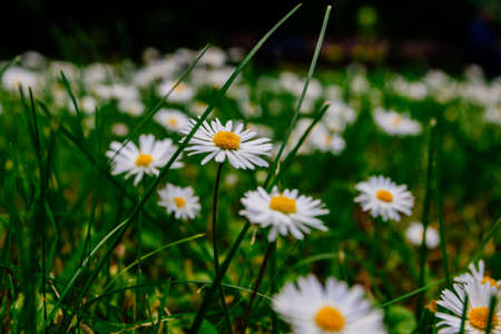 Beautiful natural backdrop of green grass and white wild growing daisies on a lawn low angle view. A forest, rural land wallpaper Surrealistic flowers