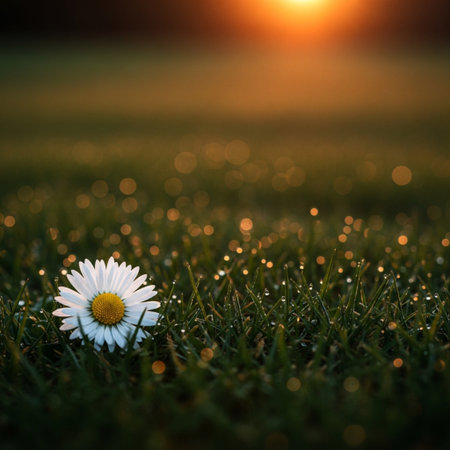 Daisy in a sunlit meadow at dawn, serene nature scene
