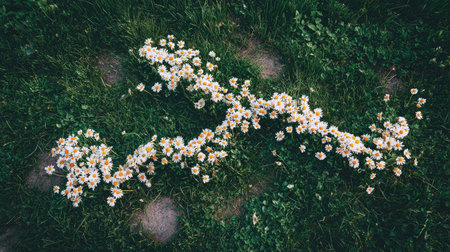 Top view of a daisy chain lying on green grass in a playful arrangement.