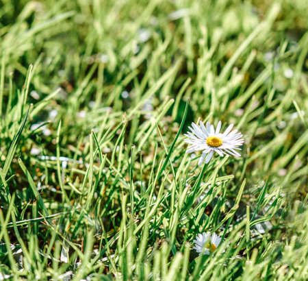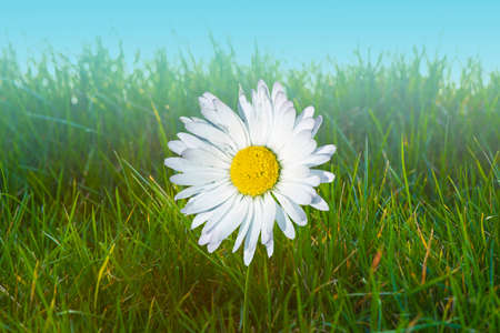 Single daisy on green lawn at sunshine