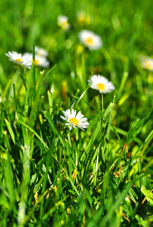 White daisies on green grass. Shallow depth of field.