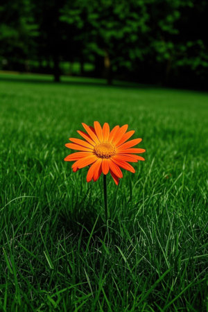 A single daisy blossoms brightly in a lush green meadow, with a soft focus background