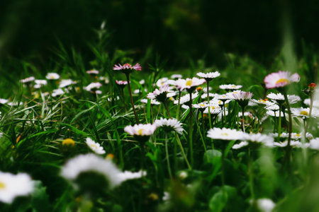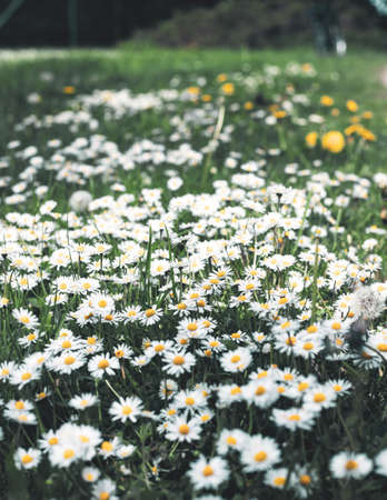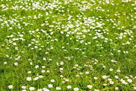 Spring and summer nature scene with blooming bellis perennis, commonly known as the white daisy