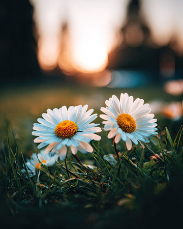 Idyllic meadow filled with vibrant wild daisies glowing under the warm hues of a beautiful sunset.