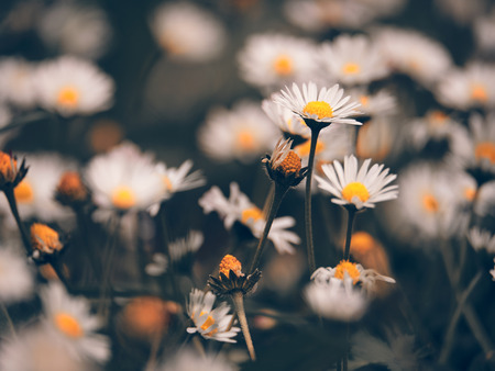 Tranquil scene of white daisies with a moody, vintage filter in a meadow at twilight
