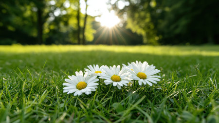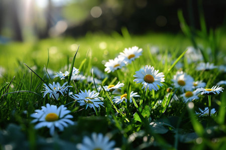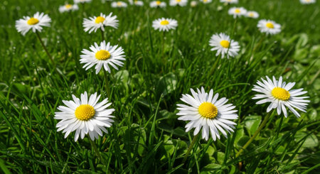 A vibrant close-up captures the delicate beauty of white daisies with bright yellow centers scattered across a lush green lawn. Sunlight illuminates the scene, highlighting the intricate details of the petals and the fresh dew drops clinging to the blades of grass. The shallow depth of field creates a soft, dreamy bokeh effect, emphasizing the natural charm and simple elegance of these common wildflowers.