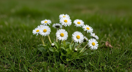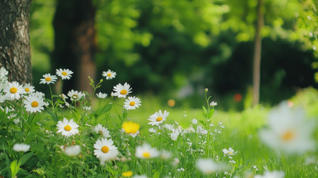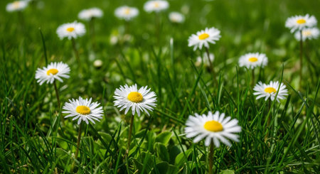 A beautiful scene of vibrant daisies blooming in a lush green meadow, showcasing the tranquility of nature during spring. Perfect for outdoor themes.