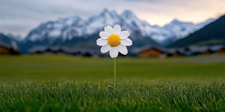 A beautiful single daisy flower stands proudly on lush green grass, framed by majestic snowy mountains under a serene sunset sky.
