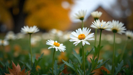 Field of daisies with autumn leaves in soft focus