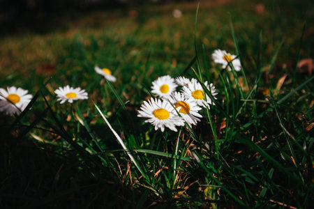High angle closeup shot showing lots of blooming daisy flowers in sunny ambiance at spring time