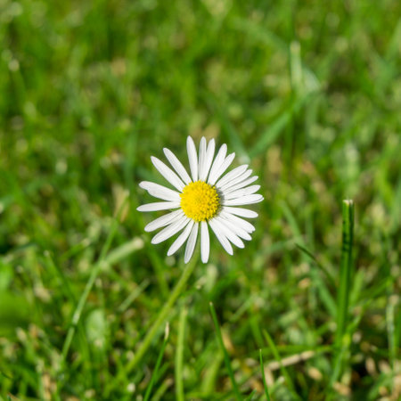 A single daisy stands prominently in a field of green grass, its white petals and yellow center in sharp focus. The image uses natural light, creating soft shadows and highlights. The composition suggests an outdoor environment, possibly a meadow or garden, suitable for various editorial and commercial applications.