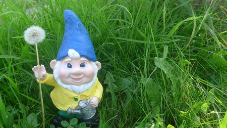 Garden gnome on the lawn close-up with copyspace. High quality photo
