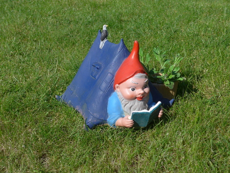 Garden dwarf lies in his tent on a green meadow and reads a book