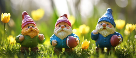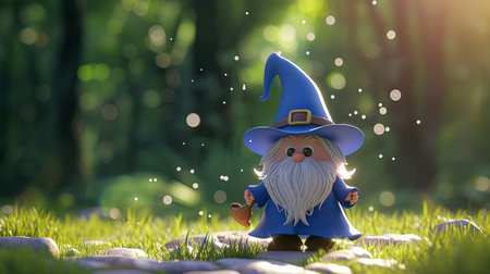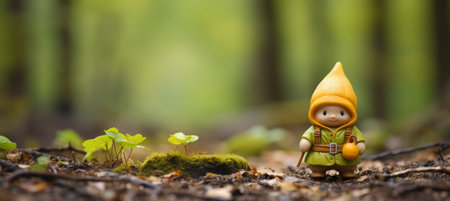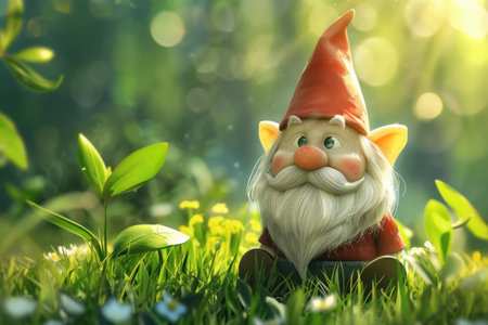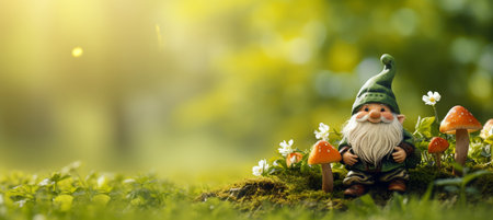 Enchanting garden gnome in spring forest, vibrant green backdrop with space for text