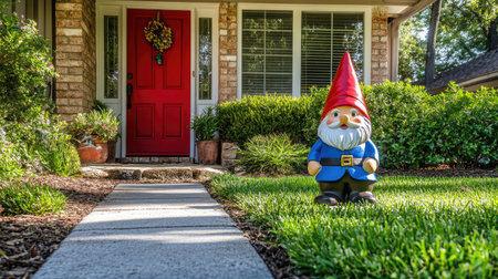 A front yard scene with a red door, garden gnome, and freshly watered lawn. The space is peaceful and devoid of any people