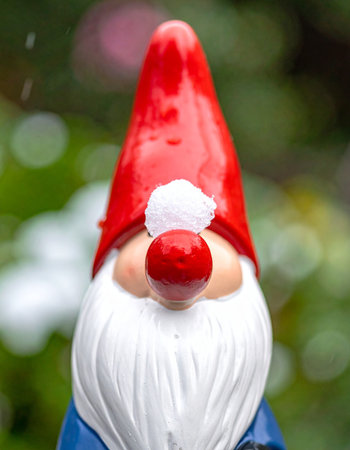 Detailed garden gnome with a red hat and beard, standing amidst nature