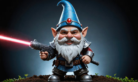 A gnome with a blue hat and a white beard stands in dirt, aiming a laser gun that shoots a bright red beam