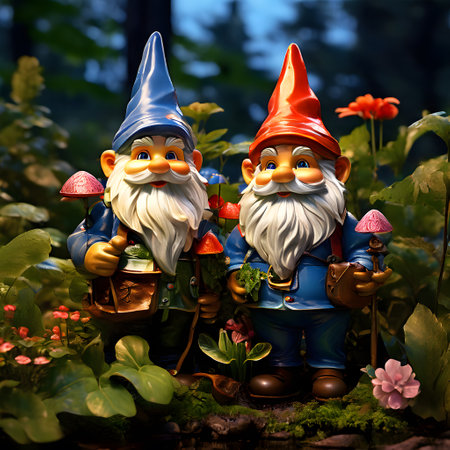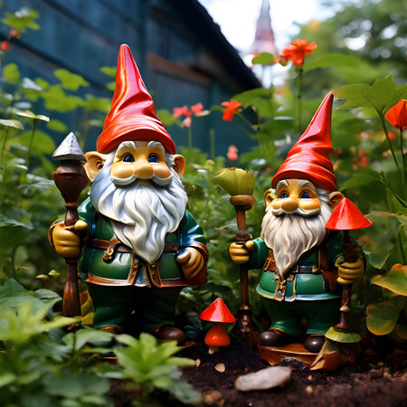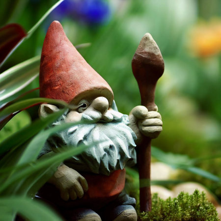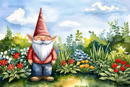 Cheerful garden gnome surrounded by vibrant plants and flowers