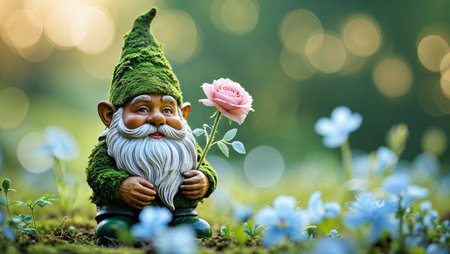 Cheerful garden gnome holding a rose among blooming flowers in soft sunlight during springtime