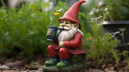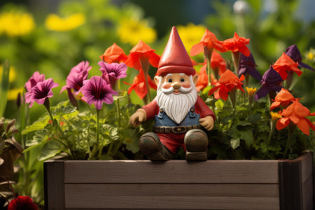 An AI generated illustration of a gnome figurine on a pot of flowers in a garden