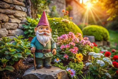 A whimsical garden gnome stands amidst vibrant flowers, lush greenery, and aged stone, surrounded by tranquil ambiance in a serene morning light setting.