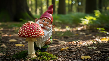 Enchanting garden gnome in vibrant spring forest with green backdrop, room for text placement