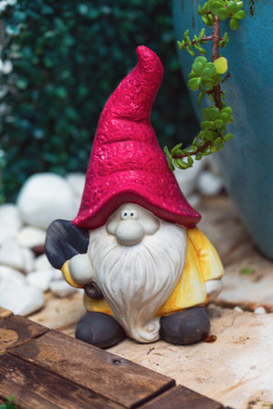 A small garden gnome figurine with a bright red hat a white beard, and a yellow coat holds a black shovel. It stands on a wooden platform surrounded by white stones and greenery with a blue background