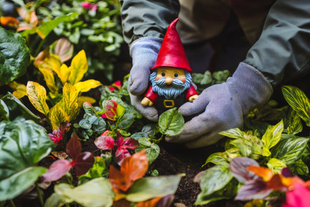 Close up view of a gardener carefully positioning a whimsical garden gnome among vibrant, colorful foliage in a beautifully landscaped garden