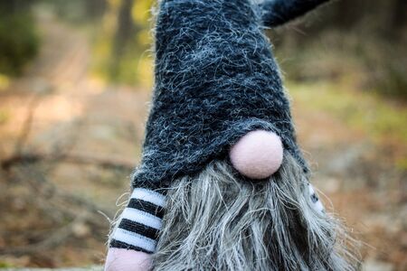 Garden gnome in spring forest with greenery, blurred natural background, copy space