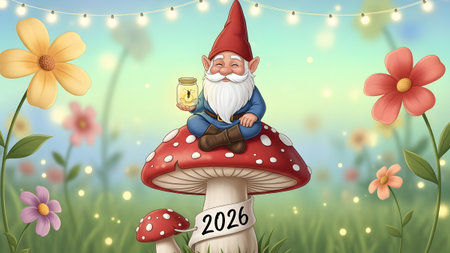 A happy gnome sits on a red mushroom with a 2026 banner and holds a jar with a firefly. Clear det...