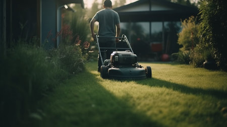 Gardener mowing the grass with a lawn mower. Generative AI