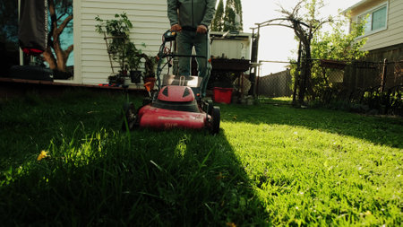 Man with lawn mower in backyard garden