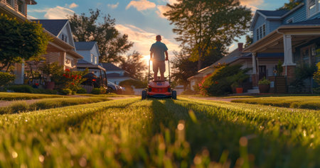 A gardener mows a lush green lawn under the warm afternoon sunlight, showcasing the beauty of nature and outdoor maintenance in a serene environment.