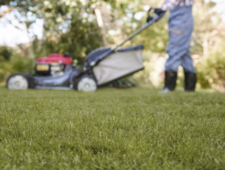 Defocused gardener pushing lawn mower