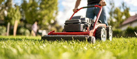 Close-up of lawn mower cutting fresh green grass, leaving a clean path in a sunny yard, perfect for a summer maintenance scene