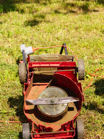 Gardening, garden service. Old lawn mower cutting green grass in backyard. Mowing field with lawnmower in sunny day.