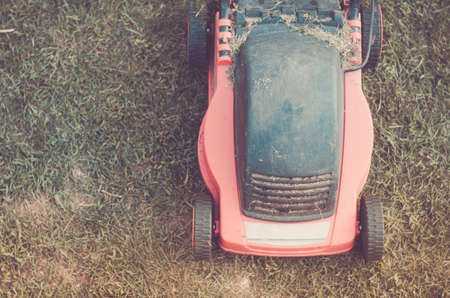 red lawn mower on the lawn/red lawn mower on the lawn. Toned. Top view