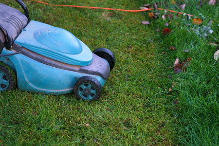 Close-up of a lawn mower against the background of the border between a cut and uncut lawn. Nearby are fallen autumn leaves and an orange cord from a lawn mower.